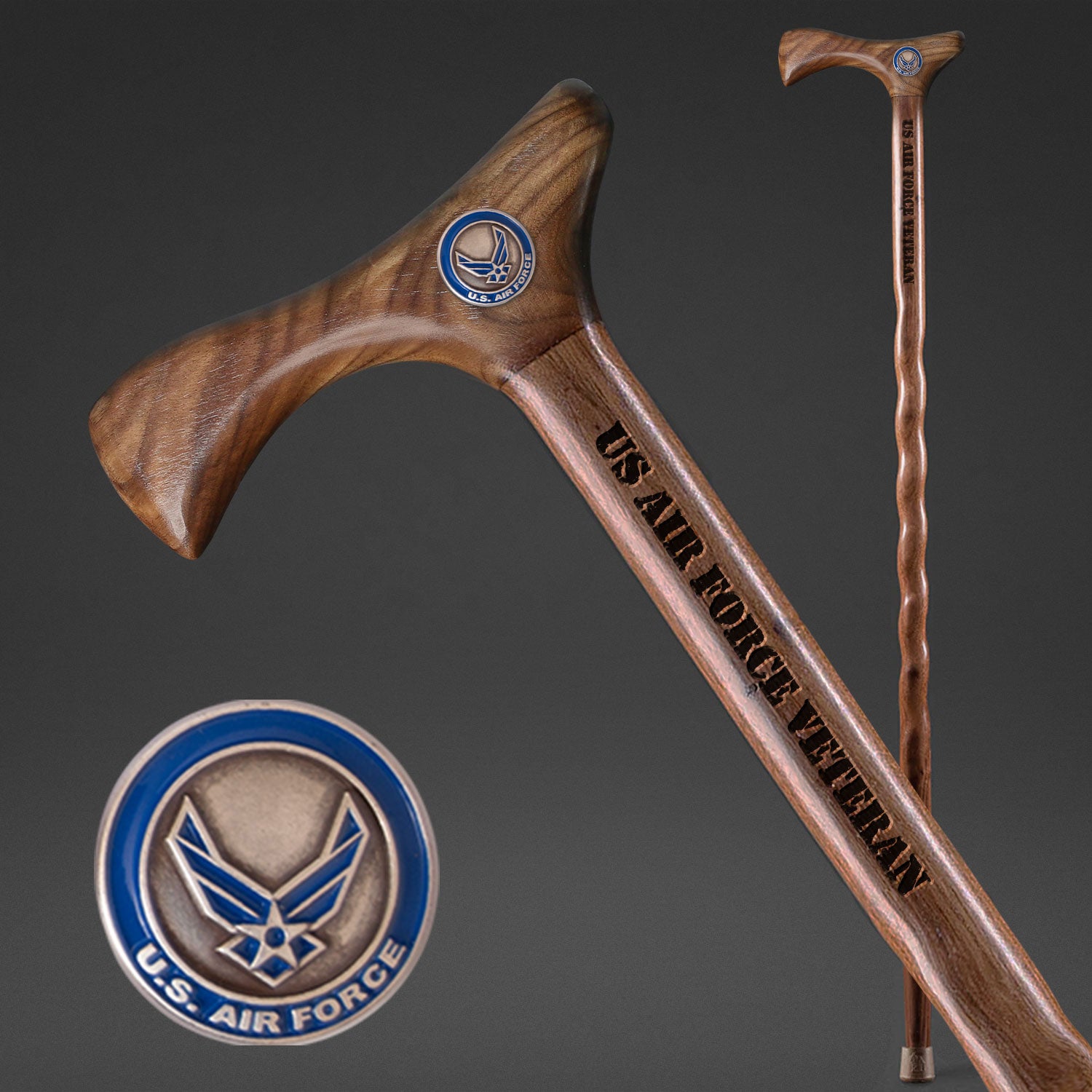 Custom engraved with "US Air Force Veteran", it serves as a proud tribute to those who have served. The ergonomic design ensures a comfortable grip, while the sturdy, handcrafted construction provides reliable support for everyday use. A clear protective finish enhances the wood’s natural beauty, ensuring it stands the test of time.
